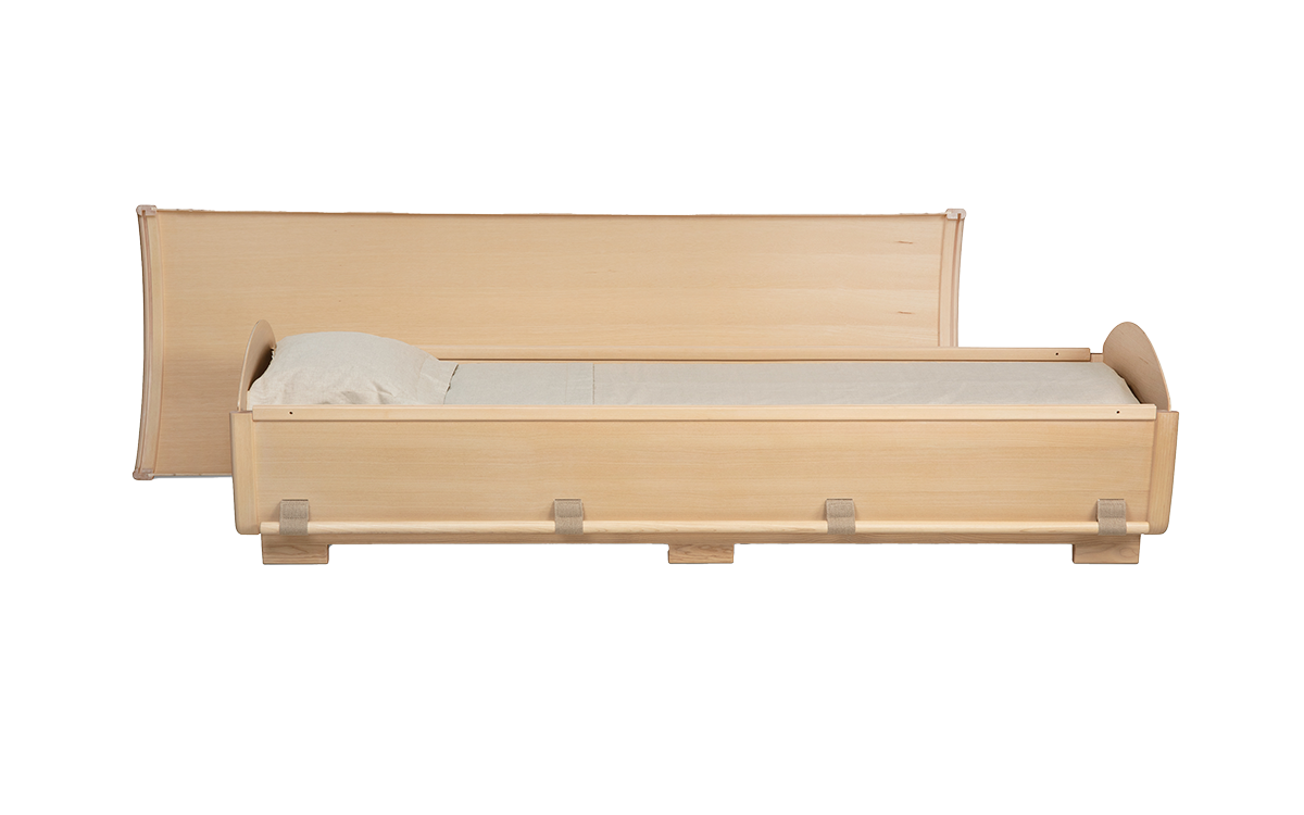 Kistan är tillverkad i oljad ask och har ett praktiskt skjutbart lock. Invändigt finner man en madrass, kudde och täcke i linnekvalitet. Den vackra bärstången i massiv ask har detaljer i rustik sadelgjord, vilket ger kistan en stilfull och naturlig känsla. Kistan är helt i trä och innehåller ingen metall, och tack vare den innovativa konstruktionen används betydligt mindre material än vid tillverkning av en traditionell kista.